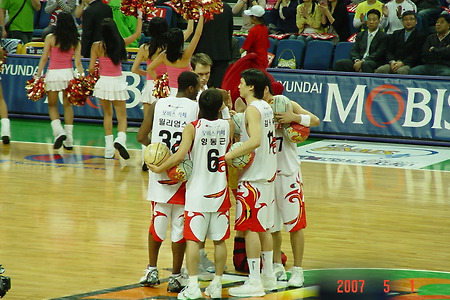 이토록 제가 사는 도시 울산에 살면서 뿌듯한 날이 없을듯합니다. 2005년 K리그 우승을 차지한 울산현대에 이어 오늘 2007년 5월 1일에 울산 모비스 피버스가 정규리그 및 포스트 시즌을 석권하며 명실공히 KBL 최고의 팀으로 등극하였습니다. 그리고 그 광경을 직접 경험했다는 사실이 대단히 즐겁습니다. 승패상 우위를 점하다가 부산 KFT의 거센 추격으로 7차전까지 가는 접전을 펼치는 결과로 입석까지 매진된 동천체육관의 입장객 행렬이 매우 대단했습니다. 친구가 인터넷 예매를 해둔 덕으로 몰래 등떠밀리듯 새치기하여 들어갈 수 있었습니다.(그때 뒤에 계셨던 분들 죄송합니다 -__- 꾸벅) 일반석 예매를 하였는데 자리가 없어 관중석 사이 계단에서 보았는데 좌측에 기자석이 있었지요. 앞으로 보시게될 사진에도 기..